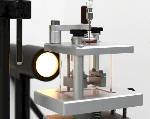 This month's featured product is our Environmental Fixture, p/n 100-14. This useful accessory is optimized for liquid/liquid and captive1 bubble studies. An inverted needle is used to produce both inverted pendant drops as well as inverted sessile drops on the underside of the substrate. Inverted pendant drops with an immiscible external liquid phase are produced to measure interfacial tension (IFT).