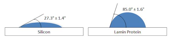 In all cases, it's important that these implants are not rejected by the body, that they integrate well with living tissue, that they last a long time, and that any other negative effects that an implant may have on the brain are minimized. To facilitate this research, a lot of work is being done in the area of surface chemistry of neural implants and intracranial electrodes. Surface modifications can reduce complications such as fibrous tissue encapsulation, extend the life of the implant, promote improved biocompatibility, and improve the integration of implant materials with living tissue. For permanently installed implants with electrodes, tissue encapsulation and cellular response are important variables. While the mechanical and biocompatible properties are also important, it's the surface layer of the materials that drives biological responses. It's critical that the mismatch between the rather rigid, dry, static, electronic, and hydrophobic implant surface and the soft, wet, ionic, dynamic, and hydrophilic biological tissue is ameliorated. A number of innovative biomaterials (e.g., graphene, conductive polymers, carbon nanotubes, and silicon nanofibers) coupled with a variety of advanced surface modifications offer researchers great promise in their quest to integrate neural tissue with man-made parts. Hydrogel coatings, for instance, are used on neural implants to increase wetting properties of the surface. When the implant surface's contact angle is lowered, protein adsorption is hindered which, in turn, limits the body's ability to detect foreign matter and reject it. Additionally, greater hydrophilicity improves the electrical signal transfer of electrodes. Hydrogels help turn a dry rigid surface into something that more closely matches soft, wet and hydrophilic neural tissue. Implants are also often coated with NPCs (or, neural progenitor cells). These cells promote biocompatibility and, like the hydrogel coatings, reduce the foreign body reaction. However, in order for NPCs to attach well to the implant surface, the surface must be made more hydrophobic. Researchers at the University of Pittsburg have had success treating silicon implant surfaces with laminin, an extracellular matrix. In tests, untreated silicon implant surfaces with an average water contact angle of 27° have been made to improve to 85° after being treated with laminin.1 See graphic below. The laminin-treated surface is now more able to accept NPCs and promote their attachment and growth.